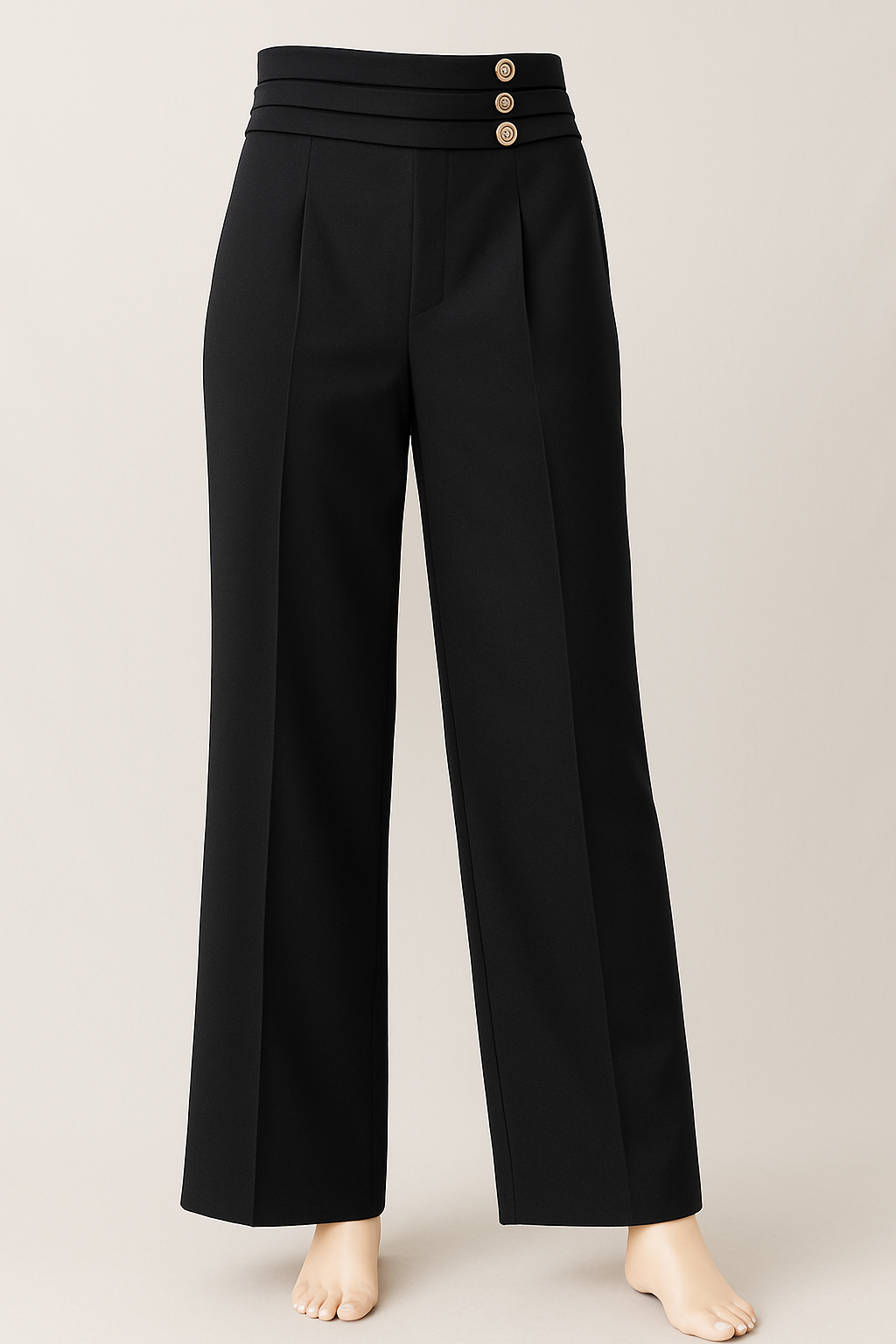 Pantalon taille haute à coupe droite avec pinces élégantes et détails de boutons dorés sur la ceinture. Une pièce chic et structurée, parfaite pour allonger la silhouette avec style et sophistication